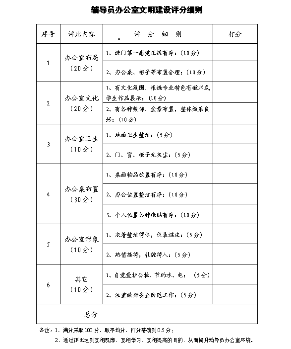 此次评比采取打分制,满分100分,评比项目包括办公室布局、办公室文化、办公室卫生、办公桌布置、办公室个人形象、办公室设施维护6个方面,13个评分细节。经过最终评选工学院辅导员办公室荣获二等奖。