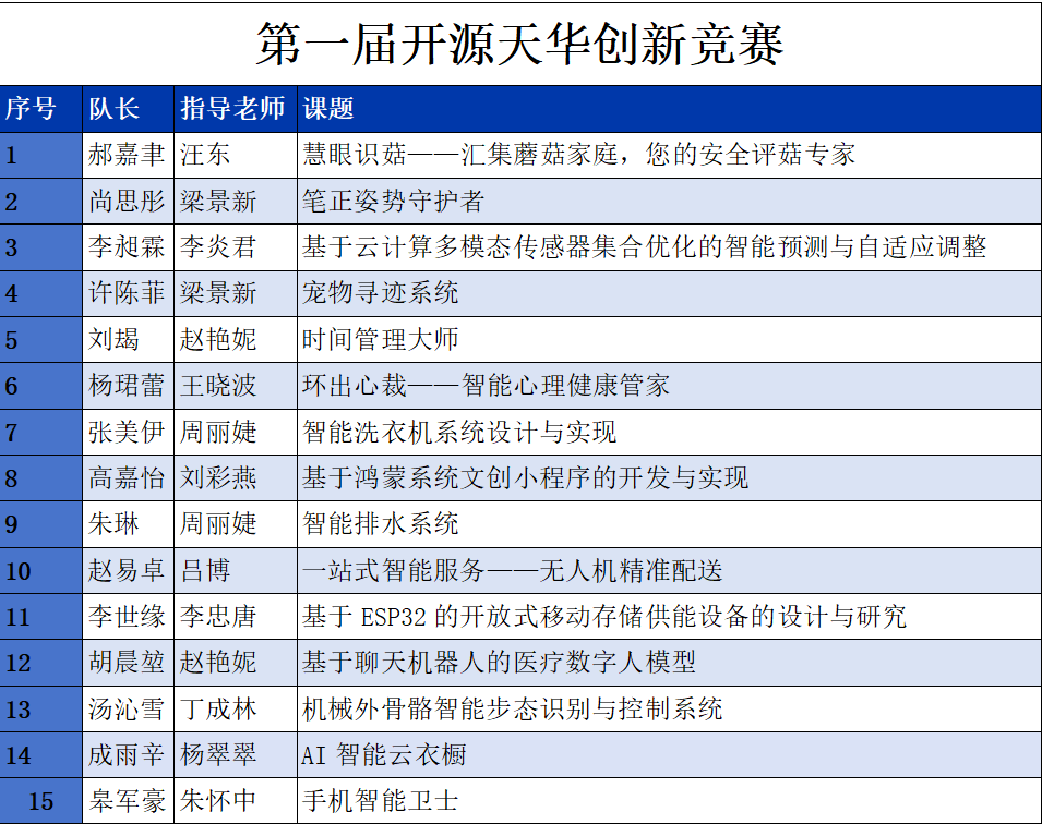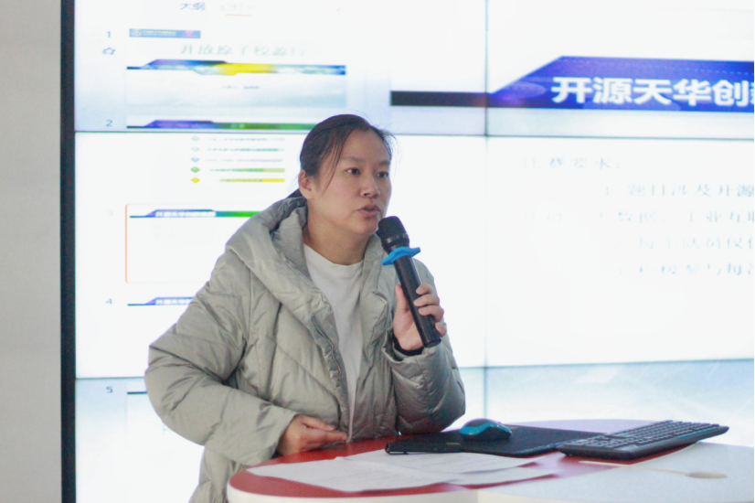 会议最后,赵艳妮老师公示了首届开源天华创新竞赛的参赛报名信息,其中有15支队伍,包括12名指导老师,100名学生(56男,44女),27个专业参与比赛,开源技术方向的技术课题涵盖云计算、移动互联网、网络安全、人工智能、区块链、大数据、工业互联、电子信息等。赵老师讲述了参赛的要求,并祝愿大家在比赛中勇于创新,敢于突破,取得优异的成绩。