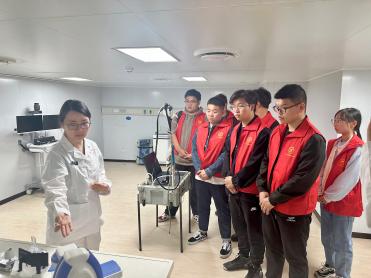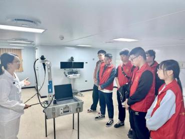 随后,大家进入了和平方舟的内部。在消化内科,和平方舟的海军军医们向学生们展示了从传统的胃镜检查到胶囊胃镜的演进历程。在和平方舟上使用的胶囊内窥镜小巧便携,患者只需吞下胶囊,便可完成一次舒适化的胃肠道检查。这项技术不仅在国内得到了广泛应用,还远销至英国、法国、德国等国家,展现了中国在医疗领域的领先地位。