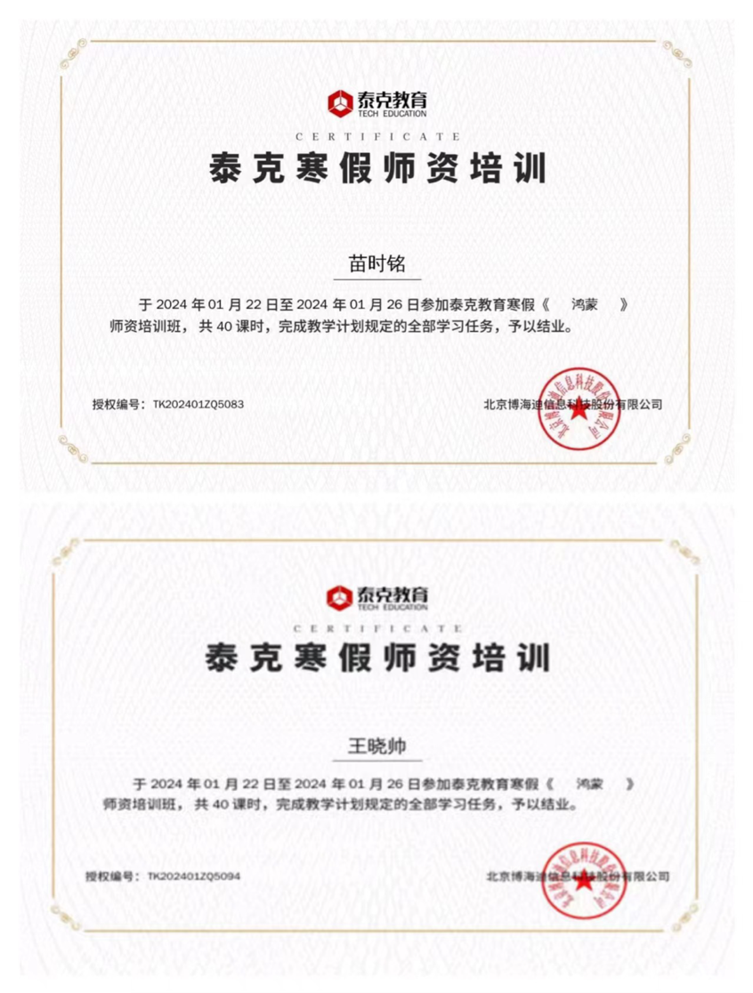 (苗时铭和王晓帅两位同学利用寒假成功取得了相关专业的培训证书)