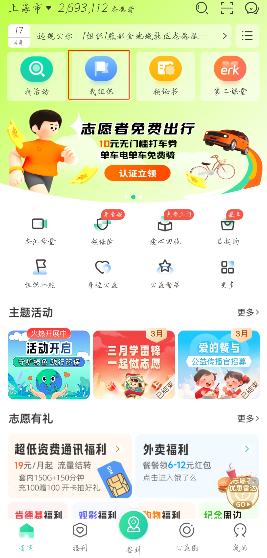 第三步:同学们登陆后,在首页中点击“找组织”,并搜索“英国上市365螺丝钉志愿者队”,点击进入。