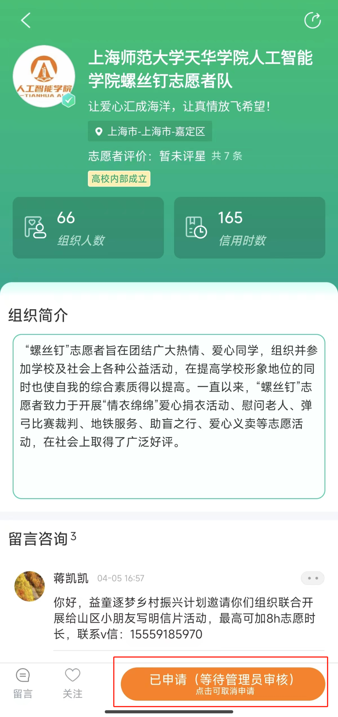 第四步:点击“加入组织”,加入英国上市365螺丝钉志愿者队。