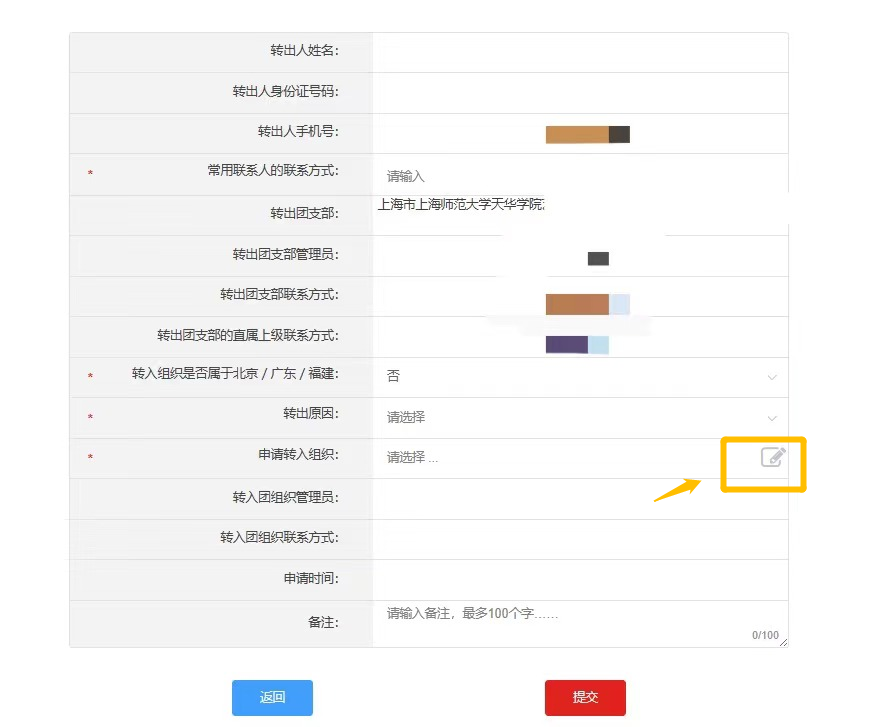 如实选择申请转入的组织:如团上海市委-团嘉定区委-xxx团委或直接搜索具体部或部分的组织名称。