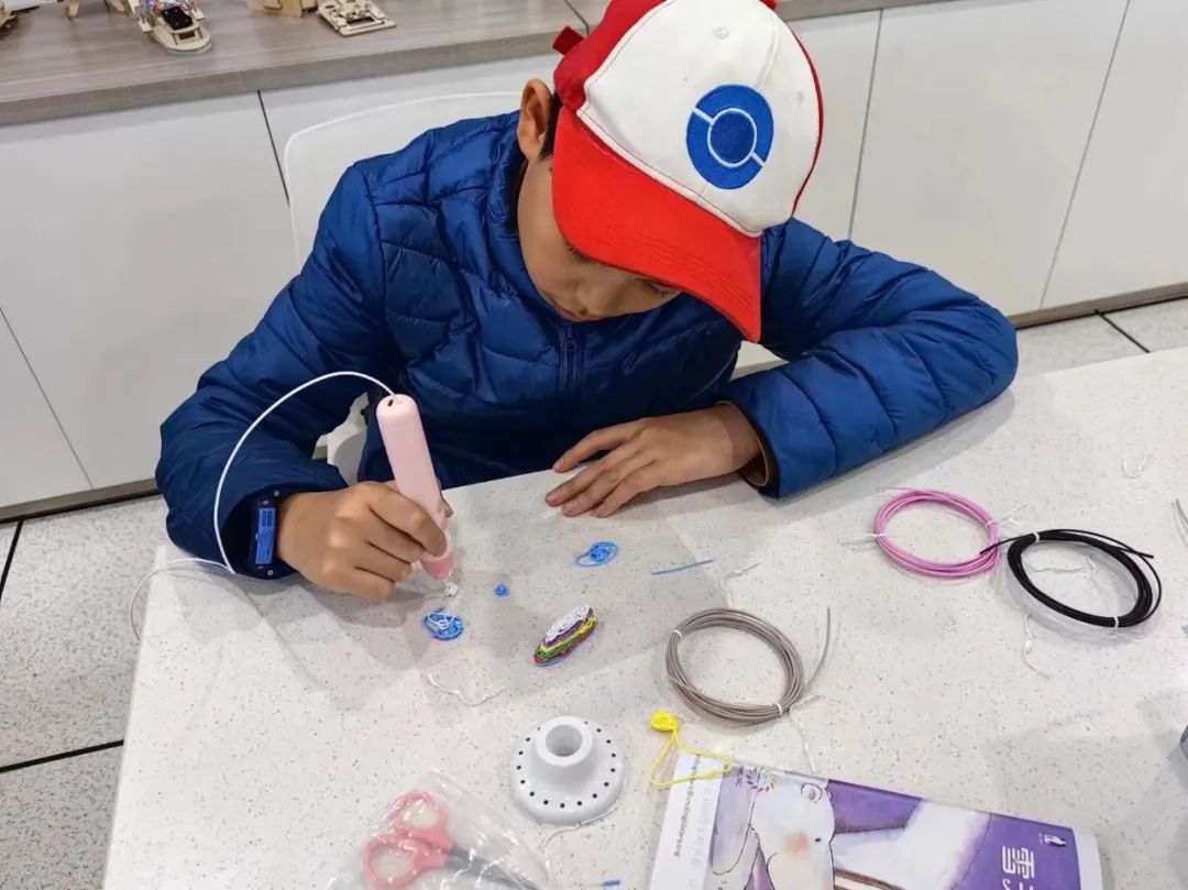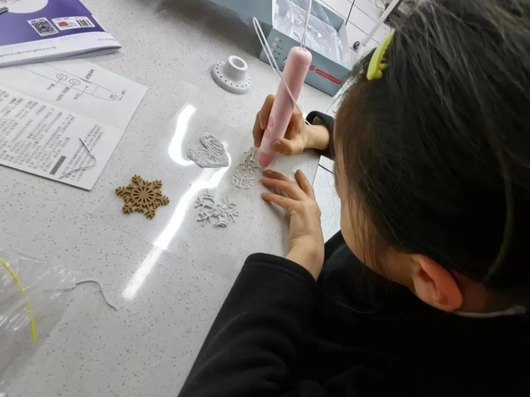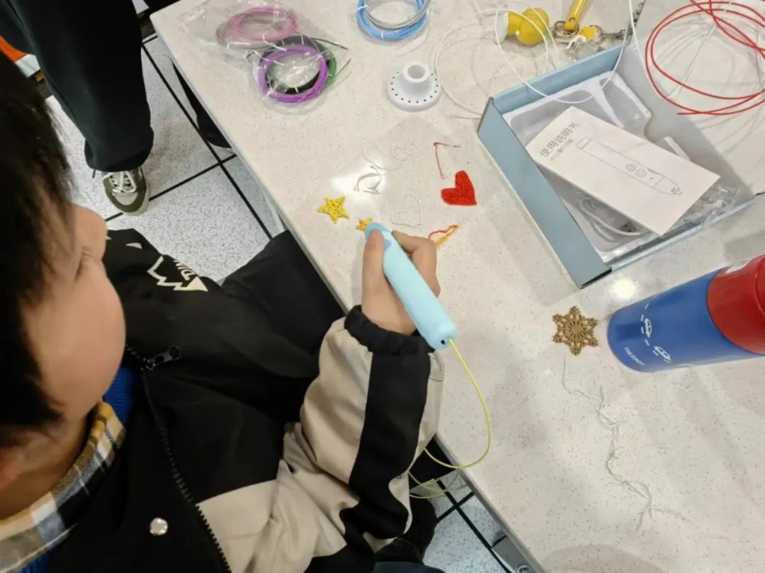 小朋友们十分积极认真,在志愿者的帮助下,不仅用3D打印笔画出了雪花,还画出了爱心、小船等,有的还尝试写出了自己的名字。