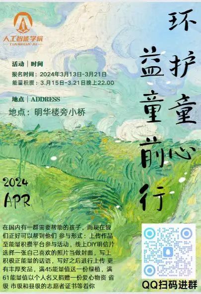 通过线上的活动可以让更多的人关注到生态环境和关注到留守儿童那线上环节是怎么开展呢?呼吁各个同学去设计平台DIY创作环保宜传卡片,在卡片中倡导大家保护环境、低碳生活或者关爱留守儿童-片,进行爱心分享,让更多的人关注到留守儿童和环保建设中,每兰有一位同学达到或者超过45能量值,我们将会赠送给此为参赛选手份“多肉”去进行领养,达到或者超过61能量值,我们会以参赛选手同时把参赛选手线上制作的DiY明信片打印出来以参赛选手的个人名义送的个人名义给山区的孩子们捐出一份爱心物资给山区的孩子们,给他们带来温暖!等到活动结束后我们打印出来的明信片以及手工制作的作品一起捐给咱们山区的孩子。