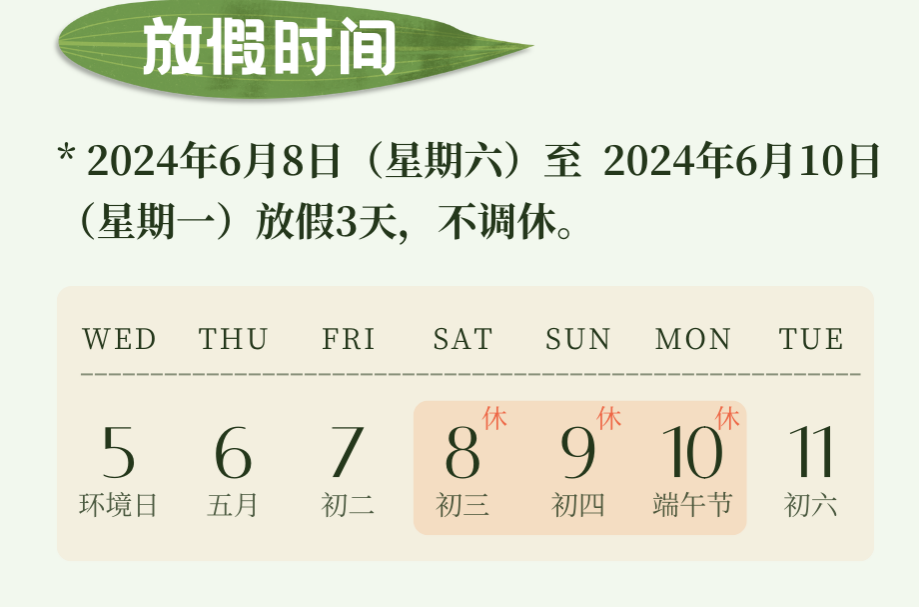 艾叶又飘香,时间近端阳。我们即将迎来一个充满传统韵味的小长假。在这个与家人团聚、品尝粽子的美好时刻,安全问题不容忽视。为了确保各位同学能够与家人共同度过一个愉快、平安的假期,特此发出以下几点温馨提示: