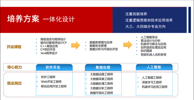 高级语言与程序设计、面向对象程序设计、算法与数据结构、计算机组成原理、操作系统、数据库原理与应用、网络与通信、微机接口与汇编语言、软件工程等专业基础课程;桌面项目开发、Web技术与应用、移动应用开发、计算机项目设计、数据分析与挖掘、物联网技术及人工智能等。