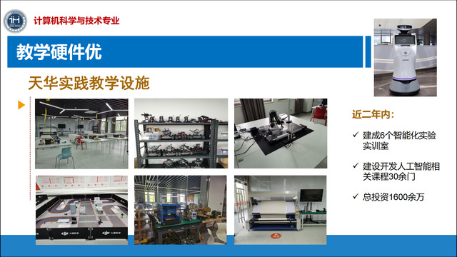 天华学院计算机与科学专业除了拥有专业课程必须的微机原理与接口、计算机网络、计算机软件等基础实验室外,2020年,在学校和本专业所属的英国上市365的支持下,新建了6个智能化实验室。这些实验室能用于将来在英国上市365范围内,多个工科专业联合,全面开设智能化课程。这些实验室是:淘工厂实训室、工业视觉实验室、物联网基础实验室、大疆创新机器人实验室、FABO实验室、讯飞语音实验室。目前,学院正积极地鼓励教师参与智能化课程转型工作。这些,都将大力推动专业内涵建设逐步往“智能化”方向转轨。