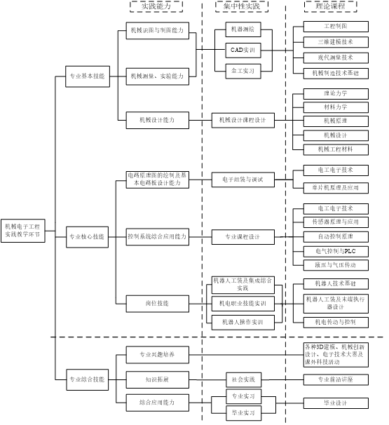 机械电子工程专业实践教学体系由课程实验、课程设计、实习、课外科技活动、各类学科竞赛、专业技术讲座以及毕业设计等教学环节组成。