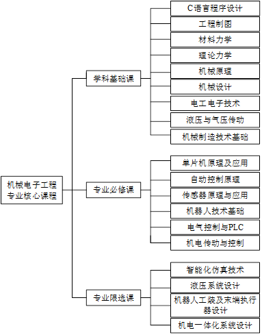 机械电子工程专业主要课程由学科基础课、专业基础课和专业限选课三部分组成。具体课程体系设置如下图: