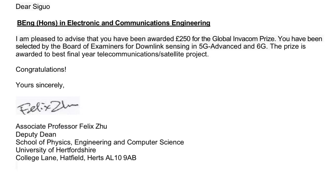 近日,学校英国上市3652020级电子信息工程专业许思果同学的毕业设计荣获英国赫特福德大学(University of Hertfordshire,简称UH)优秀毕业设计奖Global Invacom Prize。