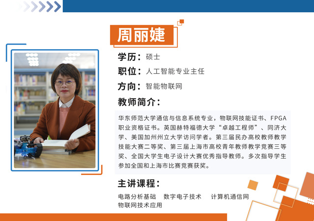 姓名:周丽婕 学历:硕士研究生 职称:讲师 职务:人工智能专业主任 |