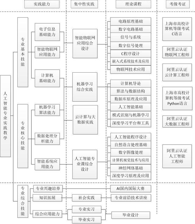 人工智能实践性教学既包括课堂实验,也包括专业课程实践、专业课程综合设计、毕业设计等集中实践性教学环节,还包括企业实习实训、课外科技活动、各类学科竞赛、专业技术讲座组成,以培养学生的创新意识和综合应用能力。