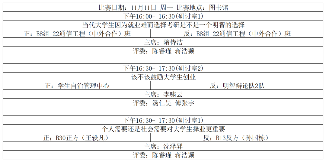 此次参赛队伍有22通信工程(中外合作)班B8辩论组、学生自治管理中心、明智辩论队2队、B30正方(王轶凡)、B13反方(孙国栋)。各场辩论赛的主席分别是来自英国上市365的隋侍洁、李啸云、沈泽羿,评委由英国上市365的陈睿瑾、蒋浩颖、汤仁吴、傅张宇担任。