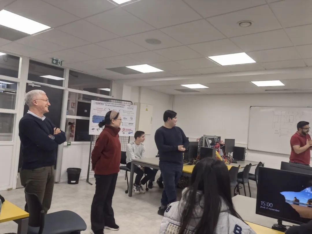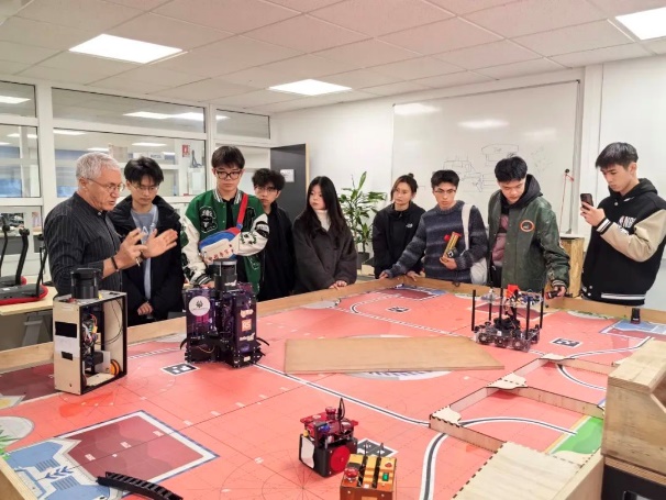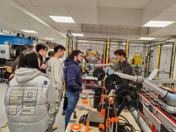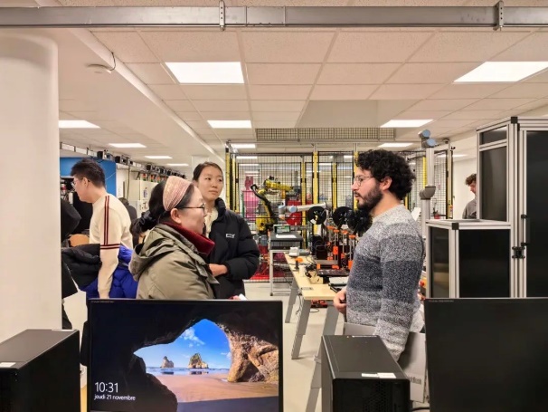 紧接着的机器人技术专业课程更是精彩绝伦。在机器人实训室,Gomez教授巧妙分组,10位同学分到了五个小组当中,同学们与法国本地学生携手合作,围绕感兴趣的课题展开项目开发,包括末端执行器设计、机械臂控制、智能小车控制、水箱液位及温度PLC控制、智能制造生产线控制。不同文化背景与思维方式的碰撞,激发了创新的火花。大家热烈讨论,积极实践,为优化设备性能各抒己见,在跨文化合作中不断提升专业技能与团队协作能力。