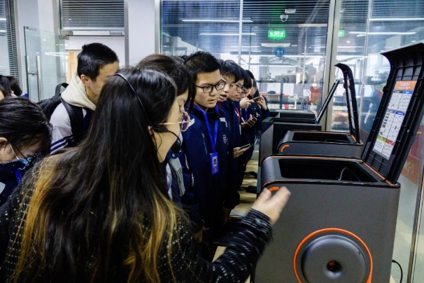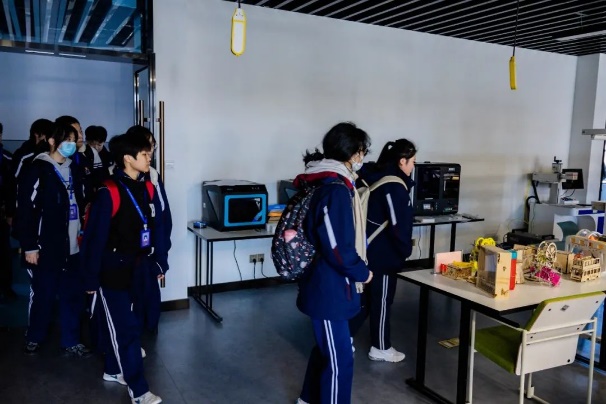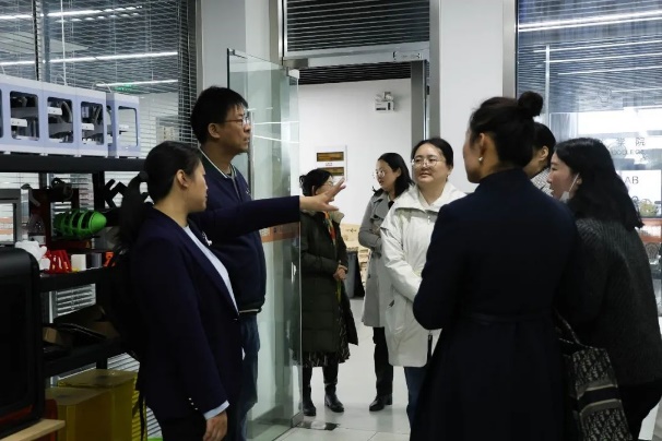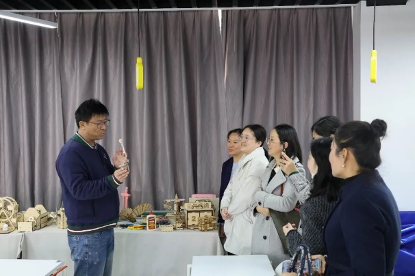 午餐休息后,双方移步至鑫华楼。天华学院英国上市365的李忠唐老师向工商外国语学院的领导们展示了学生们精心制作的作品,并介绍了学校先进的硬件设施,如激光切割机、3D打印机等,让工商外国语学院的领导们对天华学院的人工智能教学成果有了直观而深刻的认识。