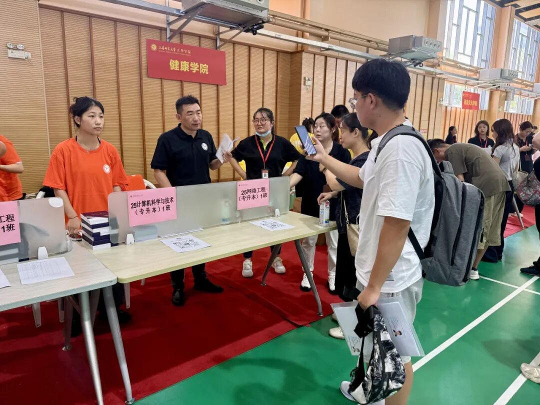 新生入校伊始,便有志愿者主动上前接过行李,全程引导办理报到手续——从信息核验、材料领取,到陪同前往宿舍安置个人物品,志愿者们细致周到的服务让新生快速适应校园节奏。过程中,志愿者还同步讲解学校配套设施使用方法与核心规章制度,为新生搭建起了解校园的“第一座桥”。