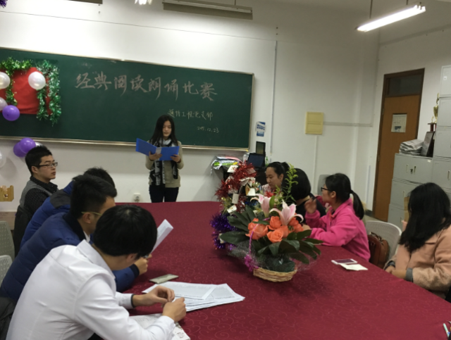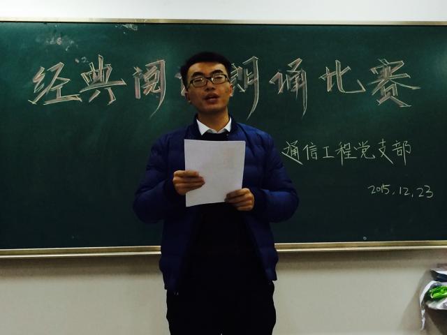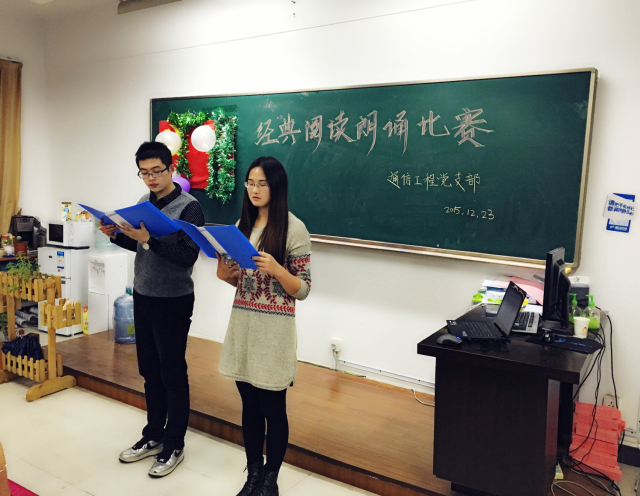 为深入开展经典阅读活动,引导同学们热爱读书,2015年12月23日,工学院通信工程党支部在明华楼351举办了一场精彩的经典阅读朗诵比赛。通信支部副书记牛风学老师及学生党员出席了本次活动。活动由通信支部学生党员韦亚平任主持人。