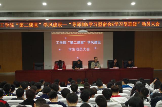 为推动我院学风建设,充分利用起最容易被当代大学生忽视的课堂外时间,帮助同学营造积极向上的学习氛围,2016年3月30日下午18:20,我校工学院在辉华楼小剧场举行第二课堂学风建设学生动员大会。莅临本次大会的领导老师有:工学院副院长徐振,工学院党总支书记刘香连,工学院党总支副书记赵科、金玫,班助理负责人牛风学及工学院全体2015级学生。会议由党总支副书记金玫老师主持。