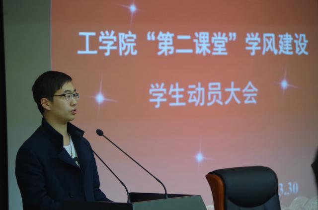 随后,工学院副院长徐振老师对“专业导师制”的内容做了详细的解说和动员,他提到,现在许多低年级的学生对自己的专业还涉足未深,对未来一片迷茫,提早将导师引入课堂可以为同学答疑解惑起到很好的引导作用,学生也可以利用好这个平台与导师拉近距离,给自己铺一条更为顺畅的前进道路。紧接着,牛风学老师就“学习型班级”宣读了评比制度,并由2015级通信专业学生宋峰旭同学代表全体学生上台,表明了自己会以身作则,积极投入到“第二课堂”学风建设活动中,使学习融入生活、生活融入学习,带动身边更多的同学共同进步。