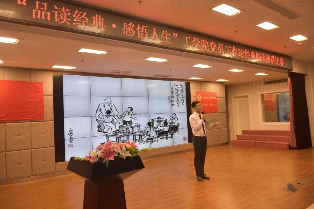 2016年5月11日,工学院党员工作站经典阅读演讲比赛在《精忠报国》慷慨激昂的歌声中拉开了帷幕,本次比赛在晖华楼小剧场举行,莅临本次比赛的领导有校党委宣传部部长齐砚奎,学保处常务副处长刘天翔,工学院党总支书记刘香连,党总支副书记暨党员工作站站长赵科,部分正副辅导员以及全体党员工作站成员,15级全体学生。